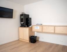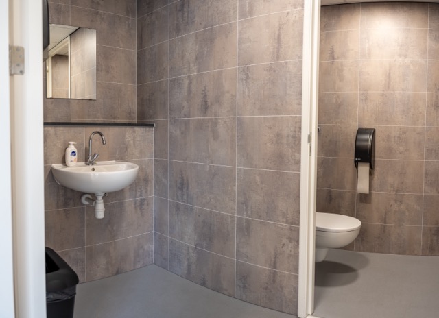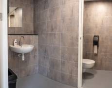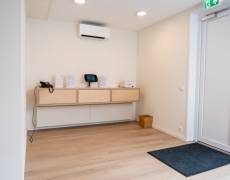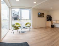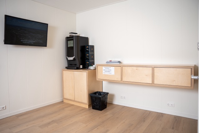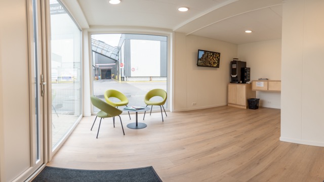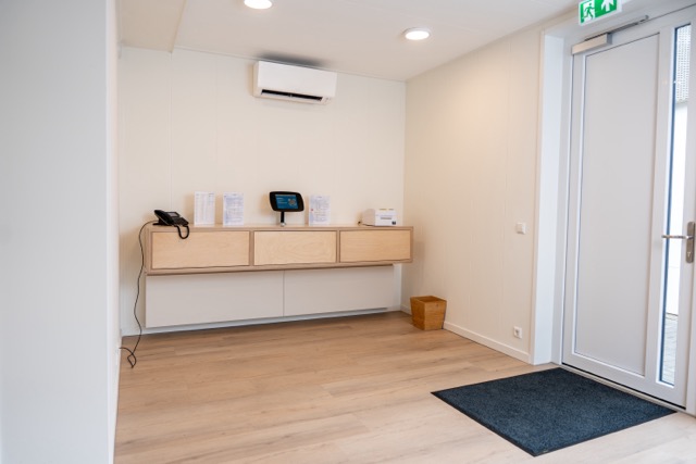 C3 Living realiseerde een open, lichte ontvangstruimte voorzien van een sanitair blok. De vloeren zijn afgewerkt met pvc in houtlook. Voor de gevraagde voorzieningen zoals presentatiescherm, aanmeldschermen en telefoon, zijn voldoende aansluitingen meegenomen.